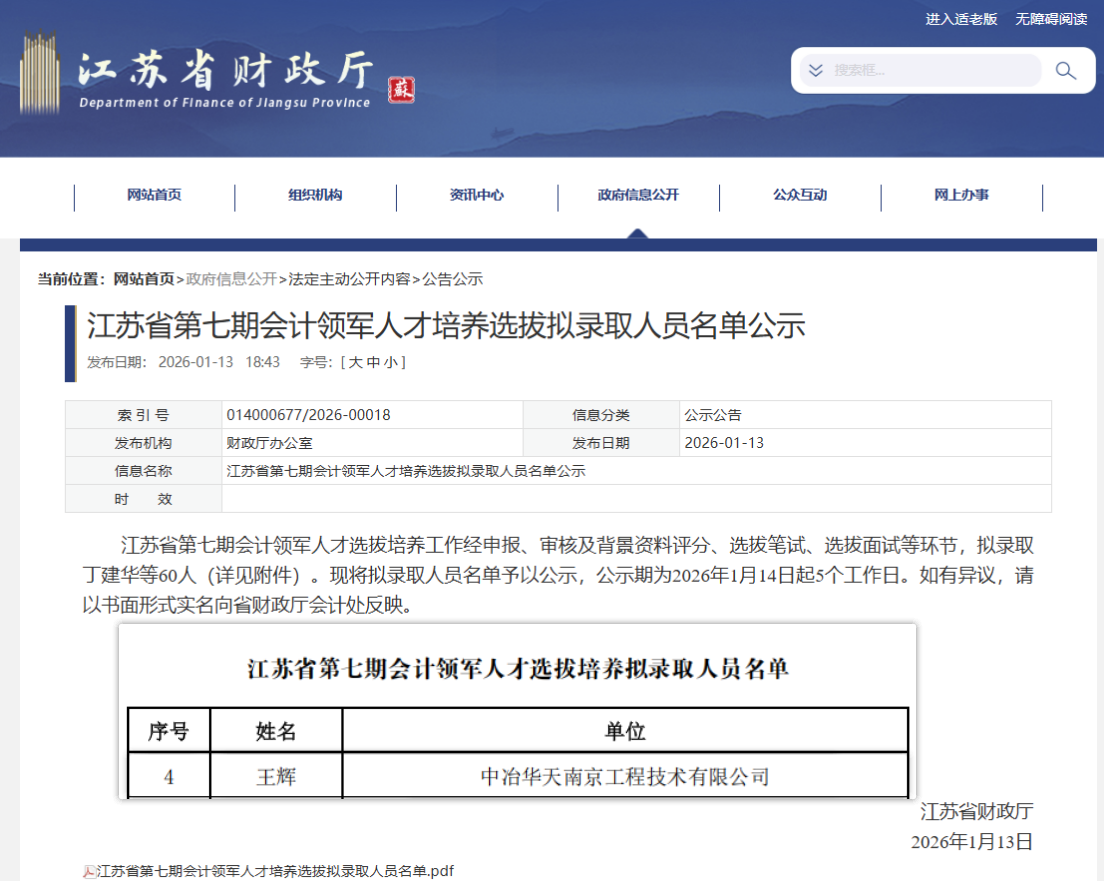 1月13日,江蘇省財政廳公布“江蘇省會計領軍人才”(第七期)擬錄取人員名單。經過申報、資格審核、背景評分、筆試與面試等多輪嚴格選拔,中冶華天財務管理部王輝從全省央國企、上市公司、三甲醫院、高等院校、獨角獸企業等各類重點單位的優秀財務負責人及總會計師群體中脫穎而出,成功入選,再次彰顯了華天財務人員的專業實力與業務素養。