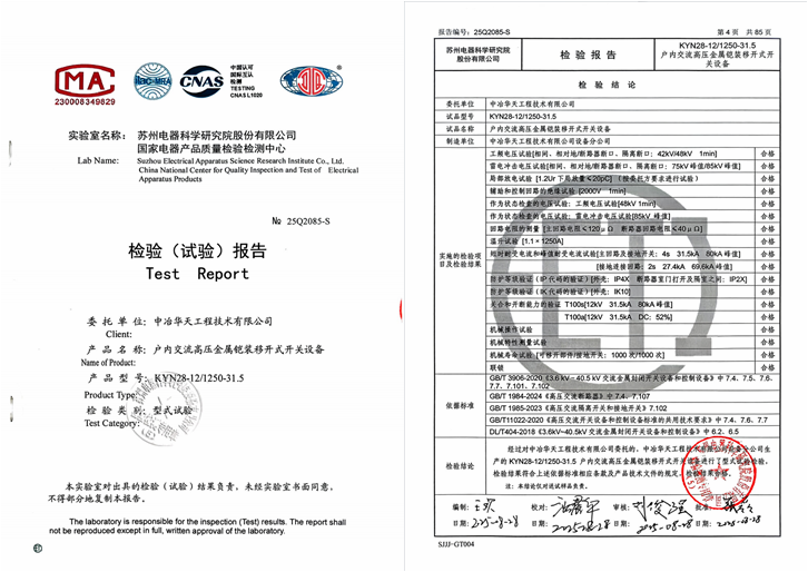 近日,中冶華天收到國家電器產品質量檢驗檢測中心頒發的戶內交流高壓金屬鎧裝移開式開關設備檢驗報告。該報告確認了由中冶華天設備分公司制作的該類型高壓電氣設備各項性能指標符合國家標準與技術規范,標志著公司成功取得該類型高壓開關設備的制作資質,為拓展自主裝備制造業務提供有力支撐。