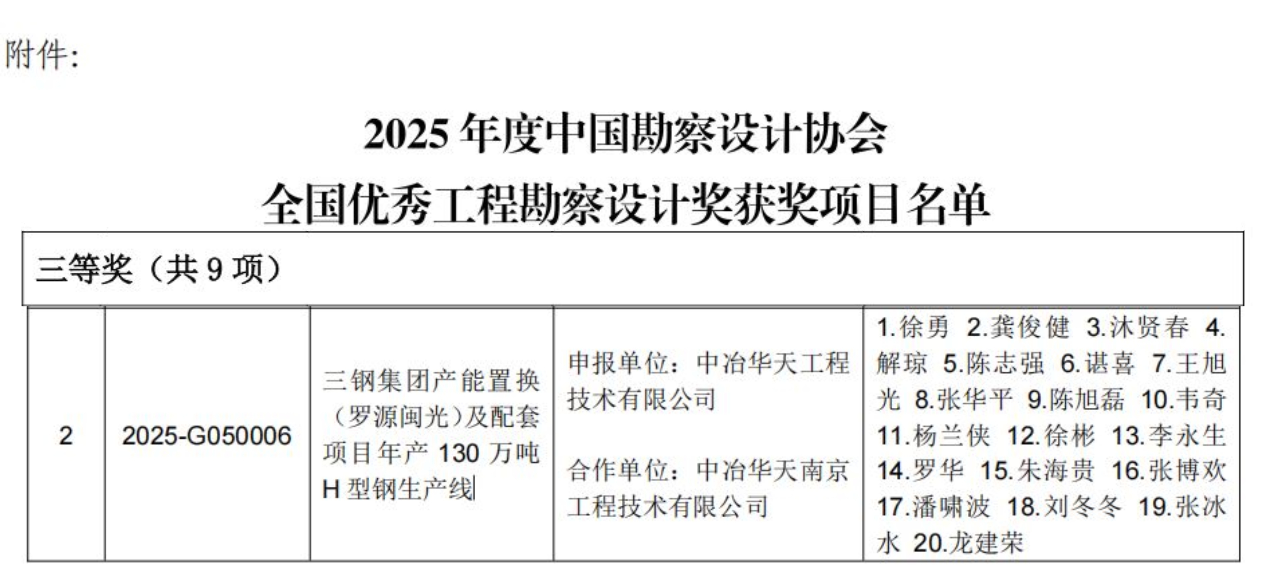 近日,2025年度中國勘察設計協會全國優秀工程勘察設計獎評選結果正式公布,中冶華天參賽項目《三鋼集團產能置換(羅源閩光)及配套項目年產130萬噸H型鋼生產線》榮獲冶金工業工程設計三等獎。這是該項目繼全國冶金行業工程設計優秀成果一等獎后再度斬獲國家級獎項,集中彰顯了中冶華天在工程勘察設計領域的創新技術優勢與深厚設計能力,也體現了行業協會高度肯定公司在高水平行業競爭中的卓越實力與領先地位。